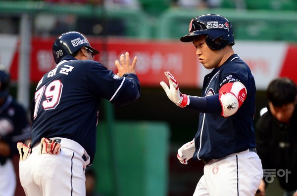 24일 인천 SK행복드림구장에서 ‘2018 신한은행 마이카 KBO리그’ SK 와이번스와 두산 베어스의 경기가 열렸다. 2회초 무사에서 두산 양의지가 SK 선발 문승원을 상대로 좌월 솔로 홈런을 쏘아 올린 뒤 김태균 코치의 환영을 받고 있다.