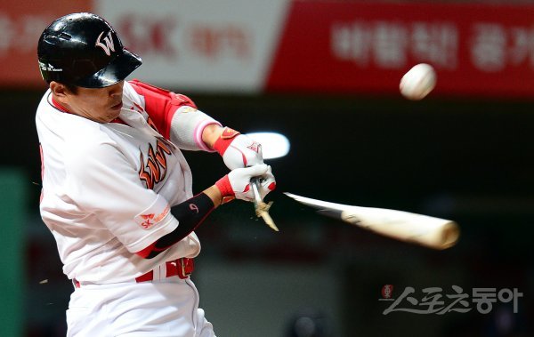 24일 인천 SK행복드림구장에서 ‘2018 신한은행 마이카 KBO리그’ SK 와이번스와 두산 베어스의 경기가 열렸다. 3회말 2사 2루에서 SK 나주환이 타격을 했으나 배트가 부러지고 있다.