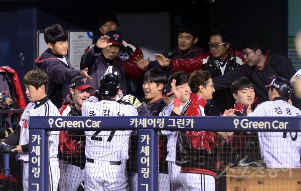24일 서울 잠실야구장에서 ‘2018 신한은행 MY CAR KBO리그’ 넥센히어로즈와 LG트윈스 경기가 열렸다. 7회말 2사 1루 LG 유강남이 중월 투런를 날린 후 그라운드를 돌아 홈인해 더그아웃에서 하이파이브 하고 있다. 잠실 | 김종원 기자 won@donga.com