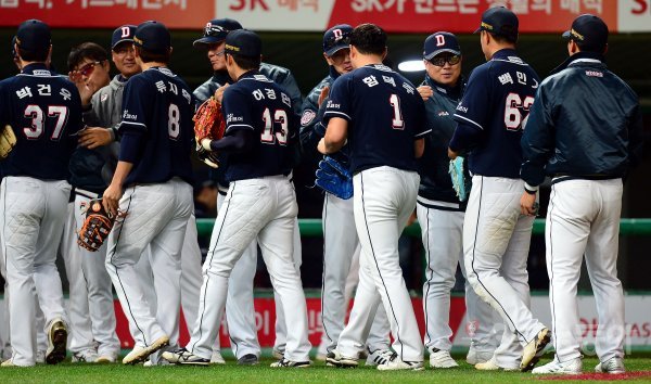 24일 인천 SK행복드림구장에서 ‘2018 신한은행 마이카 KBO리그’ SK 와이번스와 두산 베어스의 경기가 열렸다. 두산이 SK의 끈질긴 추격을 뿌리치고 10-9로 승리한 뒤 김태형 감독이 선수들을 격려하고 있다. 인천 | 김민성 기자 marineboy@donga.com