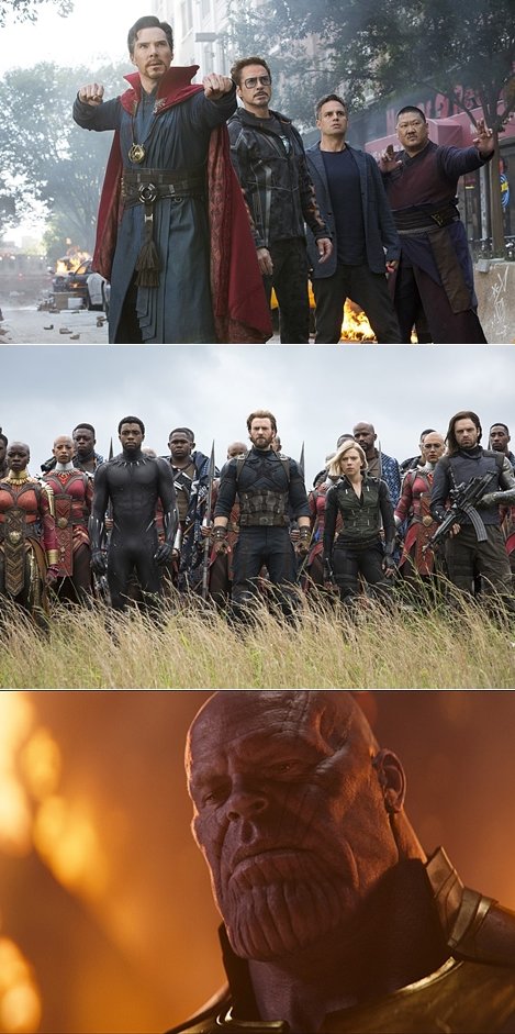 ‘혼돈의 카오스’. 영화 ‘어벤져스: 인피니티 워’가 24일 오후 언론시사회를 통해 국내 취재진에게 공개됐다. 이날 러닝타임 149분 동안 펼쳐진 전개와 엔딩은 상상 그 이상의 ‘충격과 공포’였다. 떼죽음으로 시작해 떼죽음으로 끝맺었다. 원작과의 싱크로율을 감히 언급할 수는 없지만 극장을 나서면서 허탈감에 말을 잇지 못할 정도였다.