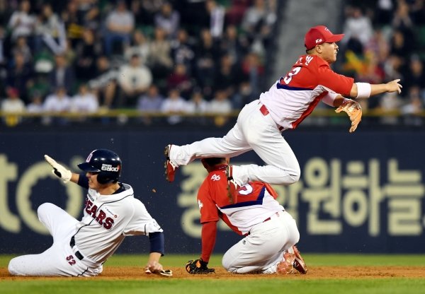 8회 초에 득점을 올리며 따라붙은 KIA는 바로 8회 말 선두타자에게 안타를 허용, 위기를 맞았지만 1사 1루에 나온 안타성 타구를 김선빈이 다이빙캐치 후 몸의 중심이 무너졌음에도 정확한 송구로 연결 지어 병살플레이를 완성시켰다.