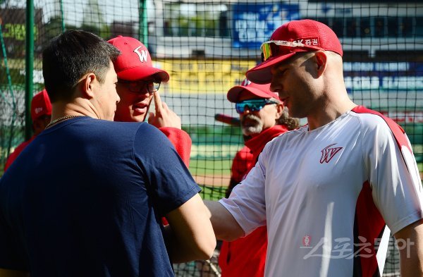 25일 인천 SK행복드림구장에서 ‘2018 신한은행 마이카 KBO리그’ SK 와이번스와 두산 베어스의 경기가 열린다. 경기 전 SK 로맥이 두산 김재환과 이야기를 나누고 있다.