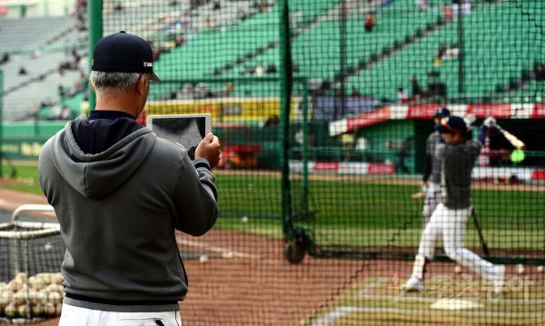 25일 인천 SK행복드림구장에서 ‘2018 신한은행 마이카 KBO리그’ SK 와이번스와 두산 베어스의 경기가 열린다. 경기 전 두산 고토 코치가 선수들의 타격훈련을 태블릿 PC로 촬영하고 있다.