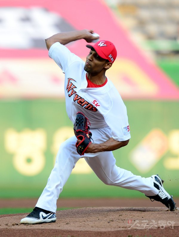 25일 인천 SK행복드림구장에서 ‘2018 신한은행 마이카 KBO리그’ SK 와이번스와 두산 베어스의 경기가 열렸다. SK 선발투수 산체스가 힘차게 볼을 던지고 있다.