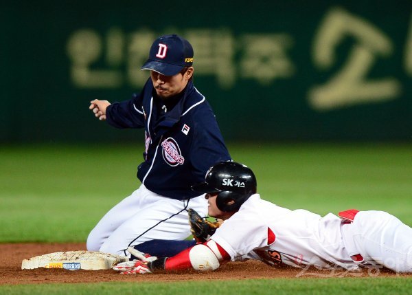 25일 인천 SK행복드림구장에서 ‘2018 신한은행 마이카 KBO리그’ SK 와이번스와 두산 베어스의 경기가 열렸다. 7회말 무사에서 SK 김성현이 안타를 치고 난 뒤 2루까지 달리다 두산 오재원에게 태그 아웃되고 있다.