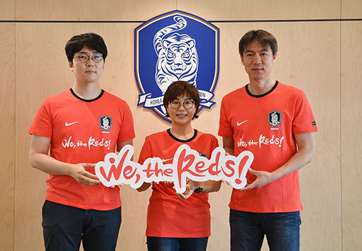 2018러시아월드컵 개막 D-50을 맞은 25일, 대한축구협회는 러시아월드컵 응원 슬로건 ‘위, 더 레즈(We, The Reds)!’를 발표했다. 공개 모집을 통해 선정된 ‘위, 더 레즈’ 슬로건을 직접 지은 김정란(가운데)씨가 붉은악마 이동엽 의장(왼쪽), 홍명보 대한축구협회 전무와 함께 기념 촬영을 하고 있다. 사진제공 | 대한축구협회