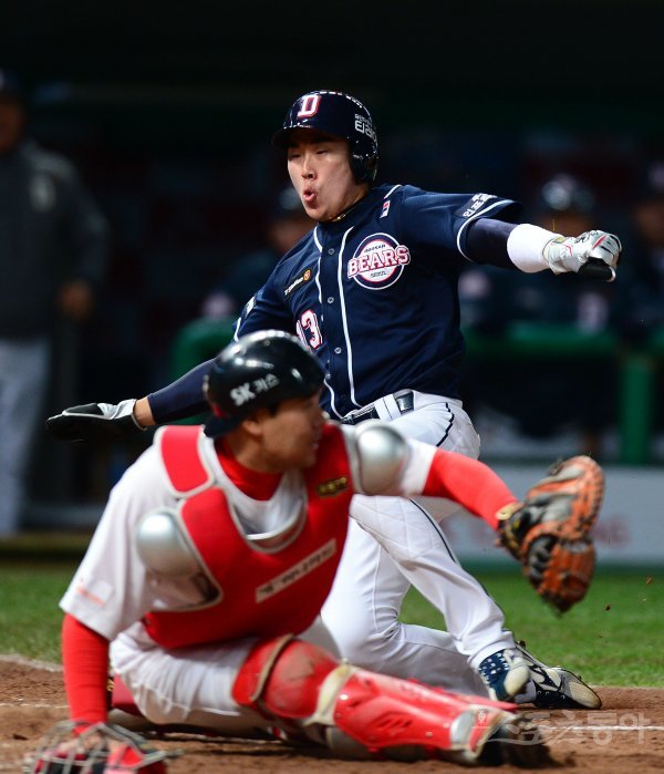 25일 인천 SK행복드림구장에서 ‘2018 신한은행 마이카 KBO리그’ SK 와이번스와 두산 베어스의 경기가 열렸다. 연장 10회초 2사 만루에서 두산 조수행의 2타점 적시타 때 2루 주자 허경민이 득점에 성공하고 있다.