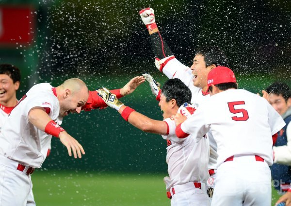 25일 인천 SK행복드림구장에서 ‘2018 신한은행 마이카 KBO리그’ SK 와이번스와 두산 베어스의 경기가 열렸다. 연장 10회말 2사 3루에서 SK 노수광이 끝내기 스퀴즈 번트를 성공한 뒤 동료들과 기쁨을 나누고 있다.