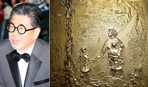 ‘금화작가’ 김일태 화백(왼쪽)과 그의 금화작품. 사진제공|김일태 화백