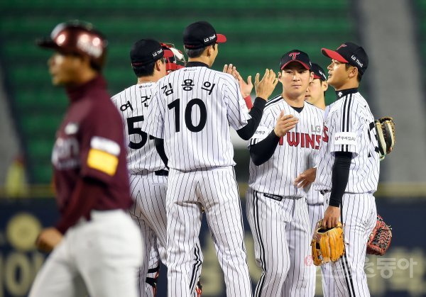 26일 서울 잠실야구장에서 ‘2018 신한은행 MY CAR KBO리그’ 넥센히어로즈와 LG트윈스 경기가 열렸다. 11-1 승리를 거둔 LG 선수들이 하이파이브 하고 있다.