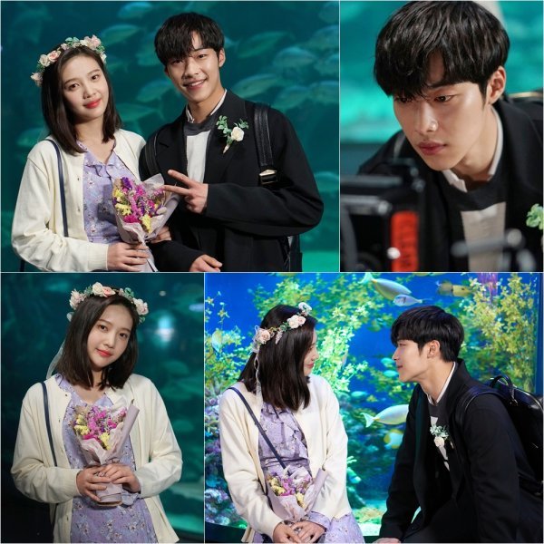 그런가 하면 우도환은 촬영 중 자신의 연기를 모니터링하는 모습. 화면에 완전히 몰입한 우도환의 진지한 눈빛은 ‘일하는 남자의 매력’을 재확인시키며 보는 이들을 단숨에 매료시킨다. 박수영은 카메라를 향해 해사한 미소를 지어 보이며 청초한 매력을 뽐내고 있다. 이에 더해 화관을 쓰고 있는 박수영의 물오른 꽃미모가 폭발하며 남심을 송두리째 뒤흔든다.