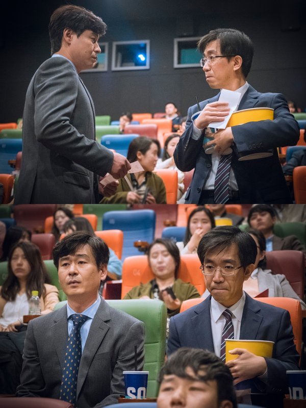 JTBC 금토드라마 ‘밥 잘 사주는 예쁜 누나(이하 예쁜 누나)’(극본 김은, 연출 안판석, 제작 드라마하우스, 콘텐츠케이) 9회에서 남호균(박혁권) 이사와 공철구(이화룡) 차장이 영화관에서 마주쳤다. 윤진아(손예진)와 영화를 보는 줄 착각하고 왔던 두 사람은 서로를 보자마자 자지러졌다. 남이사와 공차장을 한방 먹인 진아의 장난은 보는 이들에게도 통쾌한 사이다를 선사했다.