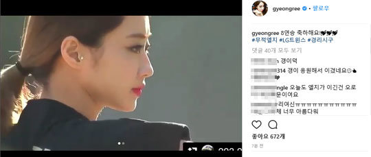 경리는 오늘(28일) 자신의 SNS에 “8연승 축하해요”라는 글과 함께 “#무적엘지 #LG트윈스 #경리시구” 해시태그를 걸었다.