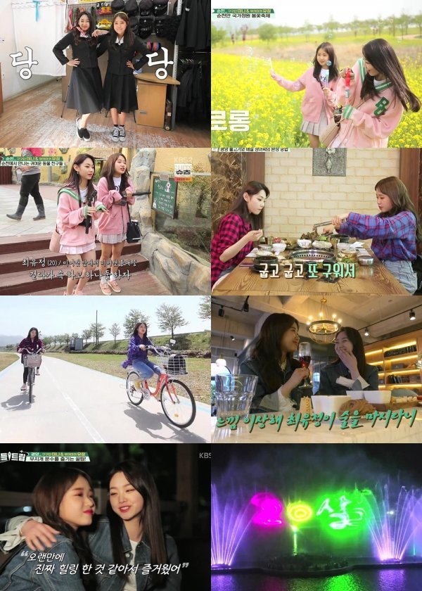 ‘유봄나봄 투어’의 첫 여행지는 순천. 두 사람은 20살을 맞이해 함께 떠나는 첫 여행인 만큼 동이 트기도 전에 출발할 정도로 여행에 의지를 불태웠다. 유정이 계획한 순천 여행의 첫 코스는 순천 드라마 촬영장. 국내 60-80년대를 재현해 놓은 곳인 만큼 미나-유정도 복고 교복을 빌려 입고 과거로 추억 여행을 떠났다. 드라마 촬영장을 구경하는 내내 두 사람 사이에는 웃음이 멈출 줄 몰랐고 인증샷을 남기며 즐거워하는 미나-유정의 모습은 청춘 영화의 한 장면을 떠올리게 했다.