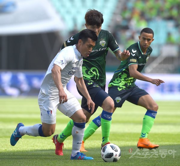 29일 전주월드컵경기장에서 열린 프로축구 ‘2018 KEB 하나은행 K리그1’ 10라운드 전북현대(1위)와 수원삼성(2위) 경기에서 전북 김민재가 수원 조원희의 공격을 밀착수비 하고 있다.