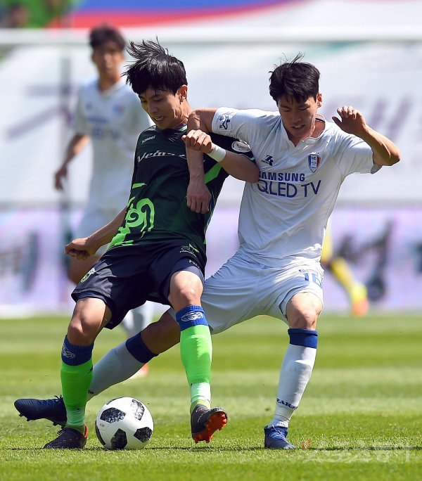 29일 전주월드컵경기장에서 열린 프로축구 ‘2018 KEB 하나은행 K리그1’ 10라운드 전북현대(1위)와 수원삼성(2위) 경기에서 전북 임선영과 수원 이종성이 볼다툼을 하고 있다.