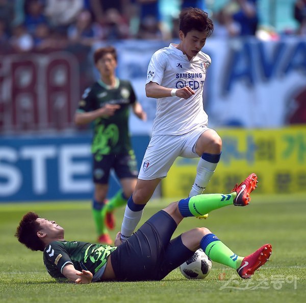 29일 전주월드컵경기장에서 열린 프로축구 ‘2018 KEB 하나은행 K리그1’ 10라운드 전북현대(1위)와 수원삼성(2위) 경기에서 전북 김민재가 수원 임상협의 공격을 태클로 막고 있다.