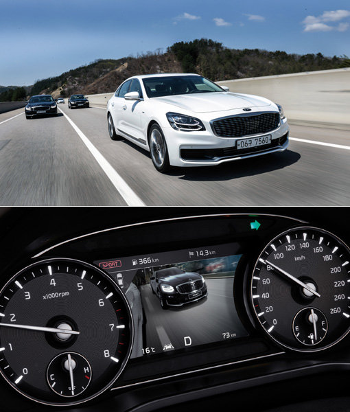 K9은 대중차 브랜드라는 한계를 ‘인텔리전스 케어’라 명명된 다양한 첨단 신기술을 통해 넘어섰다. 주행 중 차선 변경시 후측방 영상을 클러스터에 표시하는 ‘후측방 모니터’(아래쪽)가 대표적인 기능이다. 5490만원부터 시작하는 가격도 상품성 대비 경쟁력을 갖췄다는 평가다. 사진제공|기아차