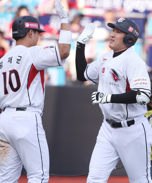 ‘유한준 전성시대’다. KT 유한준(오른쪽)의 타격감이 식을 줄 모른다. 아직 시즌 초반이긴 하지만, 0.447의 고타율을 자랑하고 있다. 19일 수원 KT전부터 꾸준히 4할대 타율을 지키고 있을 정도로 쾌조의 컨디션을 유지하고 있다. 유한준이 29일 수원 KIA전에서 8회 홈런을 터트리며 3안타 경기를 완성한 뒤 황재균과 하이파이브를 하고 있다. 사진제공|스포츠코리아