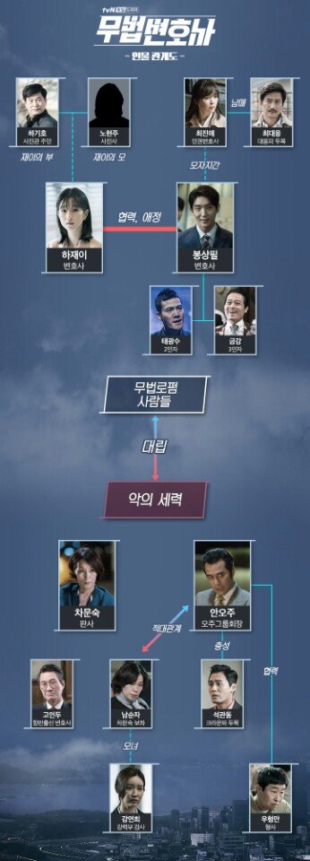tvN 새 토일드라마 ‘무법변호사’(극본 윤현호 연출 김진민) 속 인물들의 첨예한 대립각이 한 눈에 보이는 인물관계도가 공개됐다.