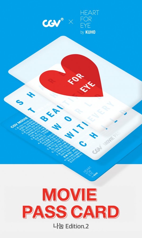 CJ CGV는 4월 30일부터 삼성물산 패션 브랜드 구호(KUHO)와 손잡고 ‘CGV 무비 패스카드 나눔 에디션(Edition)2’를 전국 50개 CGV 극장에 출시한다. ‘무비 패스카드 나눔 Edition2’는 지난 2006년부터 구호가 진행해 온 시각 장애 어린이를 위한 기부 캠페인 ‘하트 포 아이(Heart For Eye)’의 일환으로, 장애인을 위한 나눔 활동을 고객들과 함께 참여하기 위해 마련됐다. 패스카드를 구입하면 판매액의 10%를 시각 장애 어린이들의 개안 수술비로 후원하게 된다.