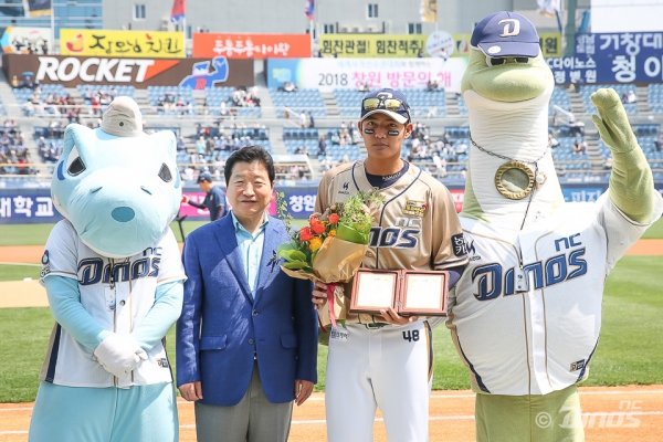 지난 29일 창원 마산야구장에서 열린 두산과의 홈경기에 앞서 NC 왕웨이중은 창원 관광홍보대사에 선정됐다. 안상수 창원시장, NC 배석현 경영본부장이 참석해 왕웨이중에게 증서를 전했다.