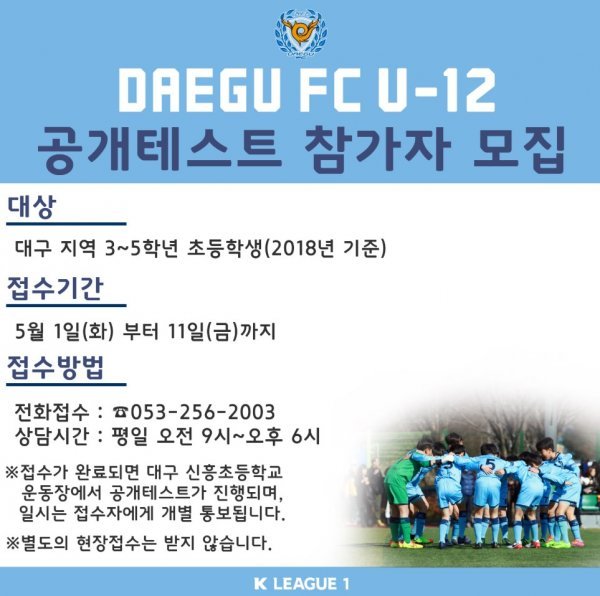 프로축구 K리그1 대구FC가 ‘미래의 스타’를 발굴하기 위해 U-12(신흥초) 공개 테스트를 실시한다.