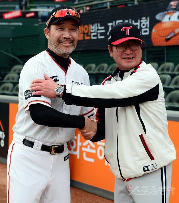1일 대전 한화생명이글스파크 ‘2018 신한은행 마이카 KBO리그’ 한화 이글스와 LG 트윈스의 경기가 열린다. 경기 전 한화 한용덕 감독과 LG 류중일 감독이 만나 악수를 나누고 있다.
