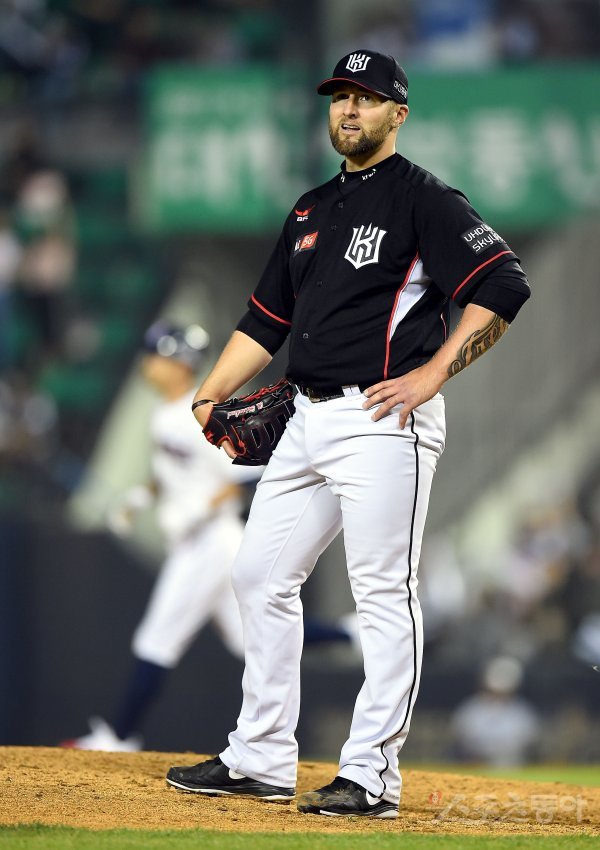 1일 서울 잠실야구장에서 ‘2018 신한은행 MY CAR KBO리그’ kt위즈와 두산베어스 경기가 열렸다. 선발 투수로 등판한 kt 피어밴드가 4회말 1사 두산 오재원에게 좌월 솔로 홈런을 허용한 후 아쉬워하고 있다.