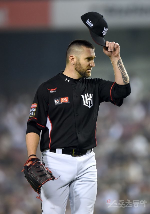 1일 서울 잠실야구장에서 ‘2018 신한은행 MY CAR KBO리그’ kt위즈와 두산베어스 경기가 열렸다. 선발 투수로 등판한 kt 피어밴드가 회말을 무실점으로 막고 더그아웃으로 들어가며 포수에게 손짓을 하고 있다.