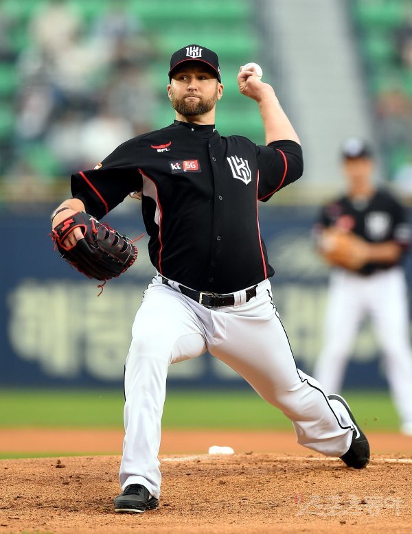 1일 서울 잠실야구장에서 ‘2018 신한은행 MY CAR KBO리그’ kt위즈와 두산베어스 경기가 열렸다. 선발 투수로 등판한 kt 피어밴드가 역투하고 있다.