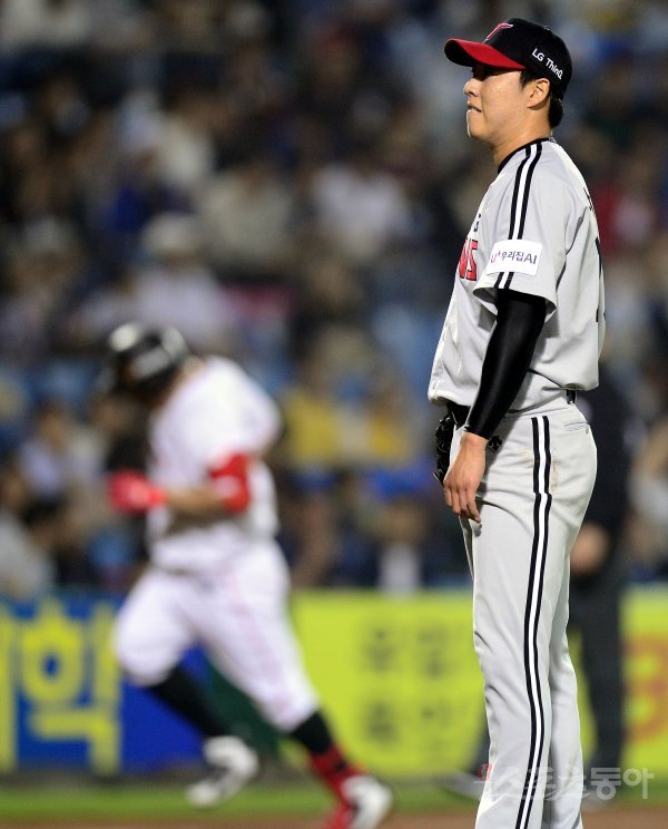 1일 대전 한화생명이글스파크 ‘2018 신한은행 마이카 KBO리그’ 한화 이글스와 LG 트윈스의 경기가 열렸다. 5회말 1사에서 한화 김태균에게 솔로 홈런을 허용한 LG 선발 차우찬이 아쉬워하고 있다.
