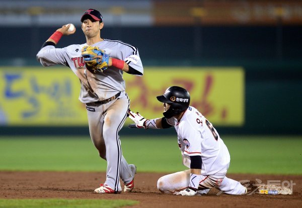 1일 대전 한화생명이글스파크 ‘2018 신한은행 마이카 KBO리그’ 한화 이글스와 LG 트윈스의 경기가 열렸다. 6회말 무사 1루에서 한화 지성준의 내야 땅볼 때 LG 강승호가 1루 주자 오선진을 2루에서 포스 아웃시킨 뒤 1루로 송구하고 있다.