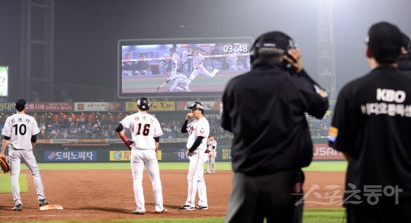 1일 대전 한화생명이글스파크 ‘2018 신한은행 마이카 KBO리그’ 한화 이글스와 LG 트윈스의 경기가 열렸다. 7회말 1사에서 한화 하주석의 내야 안타 상황을 심판들이 비디오 판독하고 있다.