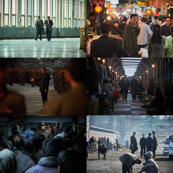또한, 사람들로 꽉 찬 기차 안에서 누군가를 다급하게 찾는 듯한 북한 국가안전보위부 과장 정무택(주지훈)의 모습은 남한의 스파이인 흑금성과 북한의 리명운 사이에서 끊임없이 긴장감을 불어넣을 것으로 기대를 모은다. 마지막 스틸에서는 흑금성과 리명운, 정무택 등이 북한의 구룡강 인근 장마당을 배경으로 서 있는 모습이 등장하며 <공작>이 선사할 드라마에 대한 기대감을 한층 고조시키고 있다.