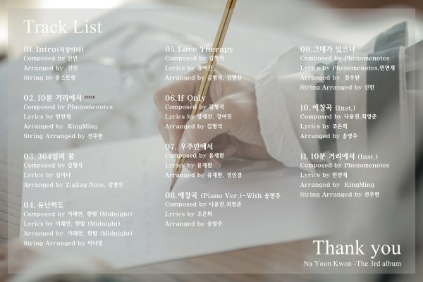 2일 나윤권은 오랫동안 기다려준 마음을 담은 세번째 정규앨범 [Thank You]의 트랙리스트와 함께 타이틀곡 ‘10분 거리에서’를 공개했다.