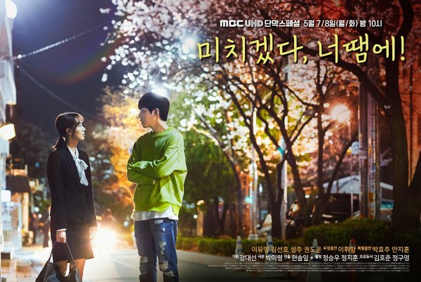 MBC가 2일 공개한 MBC UHD 단막스페셜 ‘미치겠다, 너땜에!’(연출 현솔잎, 극본 박미령) 포스터에는 ‘은성’역할을 맡은 이유영과 ‘래완’역할을 맡은 김선호가 흐드러지는 벚꽃이 아름답게 핀 야경에서 서로를 바라보며 티격태격하는 장면이 담겨 있다.