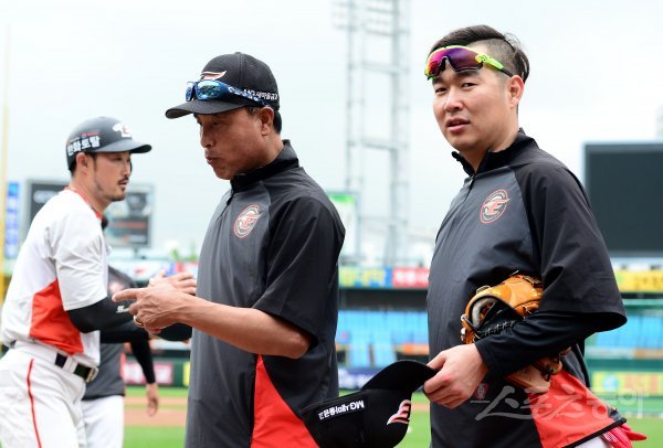 2일 대전 한화생명이글스파크 ‘2018 신한은행 마이카 KBO리그’ 한화 이글스와 LG 트윈스의 경기가 열린다. 경기 전 한화 송은범이 송진우 코치와 이야기를 나누고 있다.