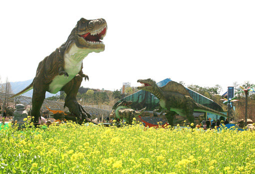 봄날을 상징하는 노란 유채꽃과 위풍당당한 티라노사우루스의 모형이 묘한 조화를 이루는 경남 고성의 당항포 공룡테마파크. 공룡 발자국과 화석 등 유물과 함께 4D 등의 첨단기술을 동원한 입체영상으로 이루어진 시청각자료가 잘 갖추어져 있다. 사진제공|한국관광공사