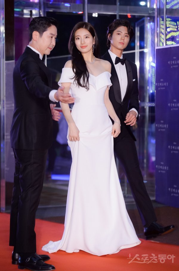 개그맨 신동엽과 가수 겸 배우 수지, 박보검(왼쪽부터)이 3일 서울 강남구 삼성동 코엑스 D홀에서 열린 ‘2018 백상예술대상’ 시상식 레드카펫 행사에 참석하기 위해 입장하고 있다.