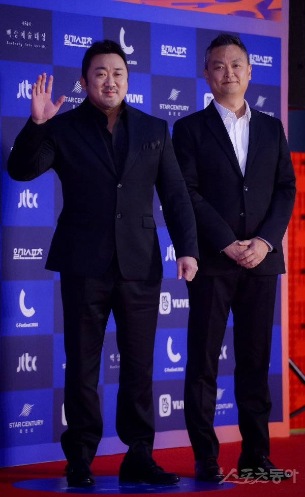 배우 마동석과 강윤성 감독(오른쪽)이 3일 서울 강남구 삼성동 코엑스 D홀에서 열린 ‘2018 백상예술대상’ 시상식 레드카펫 행사에 참석해 포즈를 취하고 있다.