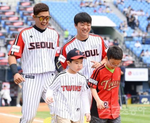 5일 서울 잠실야구장에서 ‘2018 신한은행 MY CAR KBO리그’ 두산베어스와 LG트윈스 경기가 열린다. 경기를 앞두고 어린이날을 맞이하여 LG 채은성과 고우석(오른쪽)이 어린이들과 즐거운 시간을 갖고 있다.