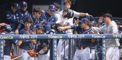 5일 서울 잠실야구장에서 ‘2018 신한은행 MY CAR KBO리그’ 두산베어스와 LG트윈스 경기가 열렸다. 두산 선수들이 1회초 2사 2루에서 투런 홈런을 치고 들어오는 김재환을 환영하고 있다.