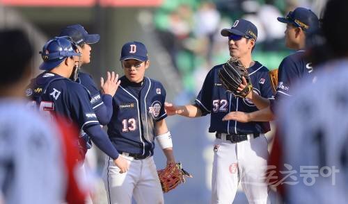5일 서울 잠실야구장에서 열린 ‘2018 신한은행 MY CAR KBO리그’ 두산베어스와 LG트윈스 경기에서 두산이 3-0 승리를 거뒀다. 경기 후 두산 선수들이 기쁨을 나누고 있다.