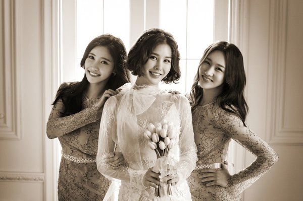사진은 웨딩 비하인드 컷으로 박은지 자매는 똑 닮은 이목구비와 시원한 미소를 보여주고 있다. 박은지는 순백의 웨딩드레스와 부케를 들고 우아한 매력을 발산하고 있으며, 양 옆에서 두 동생들은 똑 같은 드레스를 입고 환한 미소를 짓으며 상큼함을 뽐내고 있다.