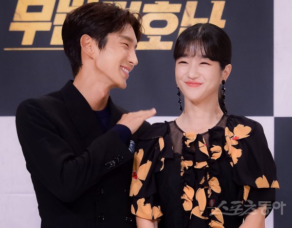 배우 이준기와 서예지(오른쪽)가 8일 서울 영등포 타임스퀘어 내 아모리스 홀에서 열린 tvN 새 토일드라마 ‘무법변호사’ 제작발표회에서 포즈를 취하고 있다.