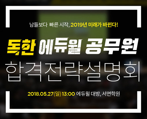 에듀윌은 이 독한 9급 공무원 수험 과정을 서울 대방학원과 부산 서면 학원 두 곳에서 운영 중이다. 두 학원은 오는 27일 오후 1시부터 독하게 공부해서 9급 공무원 시험에 합격할 수 있는 합격전략을 발표하는 설명회를 개최할 예정이다.