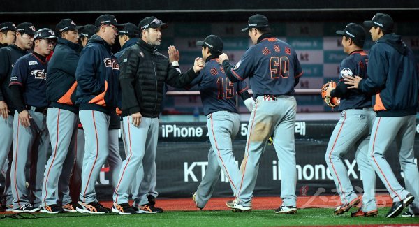 8일 수원 kt위즈파크에서 ‘2018 신한은행 마이카 KBO리그’ kt 위즈와 한화 이글스의 경기가 열렸다. 한화가 연장 접전 끝에 kt에 12-8로 승리한 뒤 한용덕 감독이 선수들과 하이파이브를 나누고 있다. 수원 | 김민성 기자 marineboy@donga.com