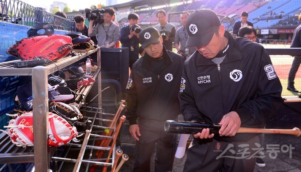 8일 서울 잠실야구장에서 ‘2018 신한은행 MY CAR KBO리그’ 롯데자이언츠와 LG트윈스 경기가 열렸다. 경기 전 심판들이 양팀 선수들의 배트를 검사하고 있다.